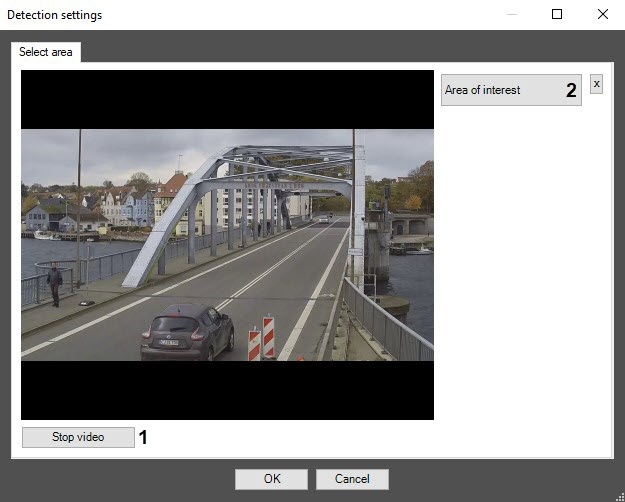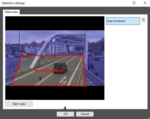 - On the captured frame, sequentially set the anchor points of the area in which the objects are detected by using the mouse (3). The rest of the frame is faded. If you don't specify the area of interest, the entire frame is analyzed.