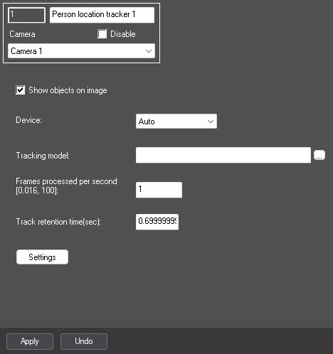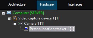 The Person location tracker software module is configured on the settings panel of the Person location tracker object. This object is created on the basis of the Camera object on the Hardware tab of the System settings dialog window.