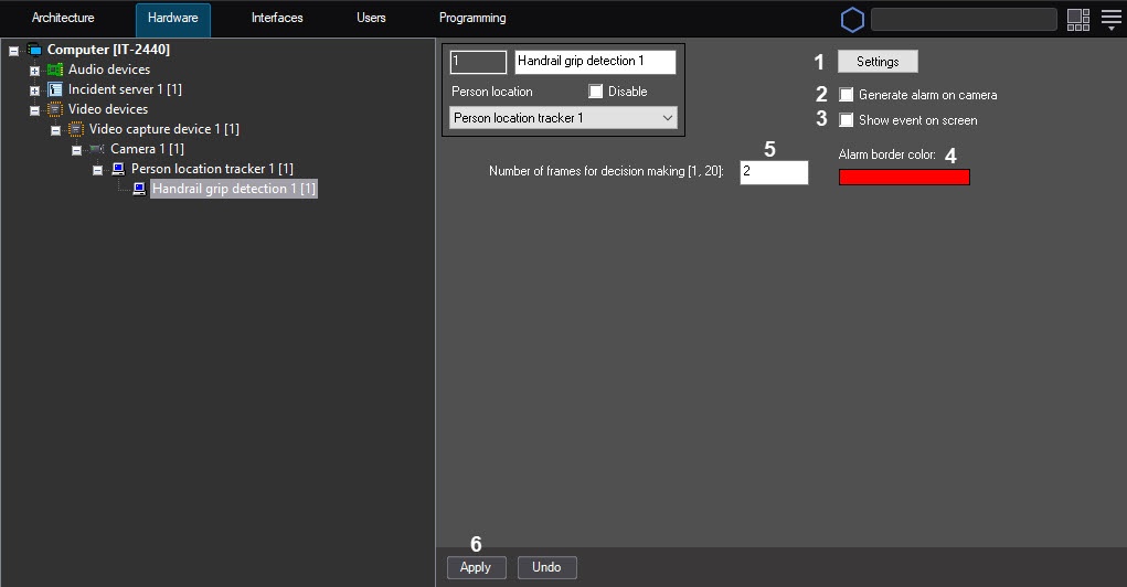 In the Number of frames for decision making [1, 20] field (5), enter the required number of frames from 1 to 20, on which a person is walking on stairs and doesn’t hold a handrail to generate the corresponding event. The default value is 2.