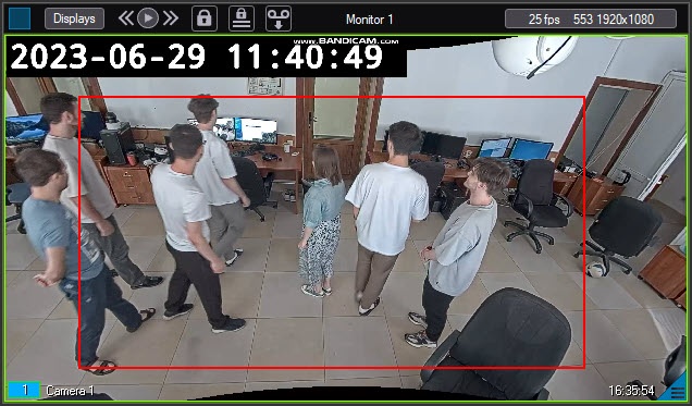 If you set the Show objects on image checkbox (see Configuring the VI detection of crowd module), when the detection tool triggers, an alarm border appears in the monitor window.