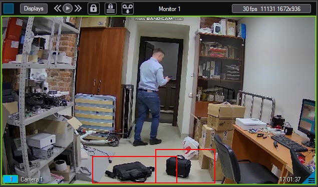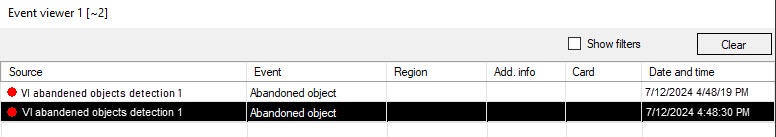 In case of an alarm in the surveillance area, the corresponding message Abandoned object from the VI abandoned objects detection object is received in the Event viewer interface window. See also VI abandoned objects detection.
