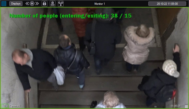 Visualization of operating the People counter detection in the Monitor window can be realized with the help of user scripts on the base of the Titles object. Detailed description of one of these scripts is presented in the Example 2. Visualization of operating the People counter detection in the Video surveillance monitor on the page Examples of scripts on the Jscript language in the section of The Script object. Programming using the JScript language document