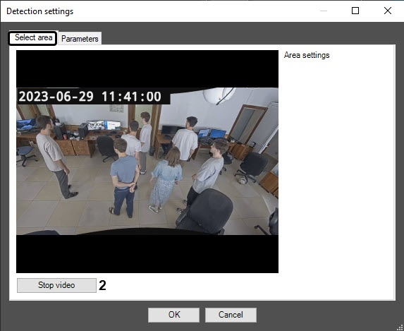 On the captured frame of the video image (3), left-click to specify the areas, the situation in which must be analyzed (1). You can add up to three areas. They are highlighted with a red frame.