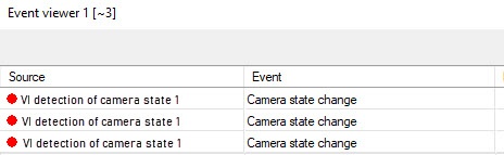 In case of an alarm in the surveillance area, the corresponding message Camera state change from the VI detection of camera state object is received in the Event viewer interface window. When an alarm in the surveillance area stops, the Triggering end event is received. See also VI detection of camera state.