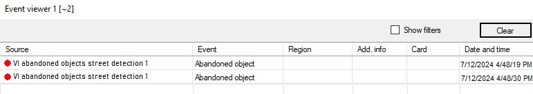 In case of an alarm in the surveillance area, the corresponding message Abandoned object from the VI abandoned objects street detection object is received in the Event viewer interface window. When an alarm in the surveillance area stops, the Triggering end event is received. See also VI abandoned objects street detection.
