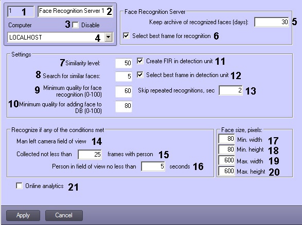 10 | Minimum quality for adding face to DB (0-100) field | Enter the value into the field | Sets minimum quality for face to be added to database in percent | % | 80 | From 0 to 100 |