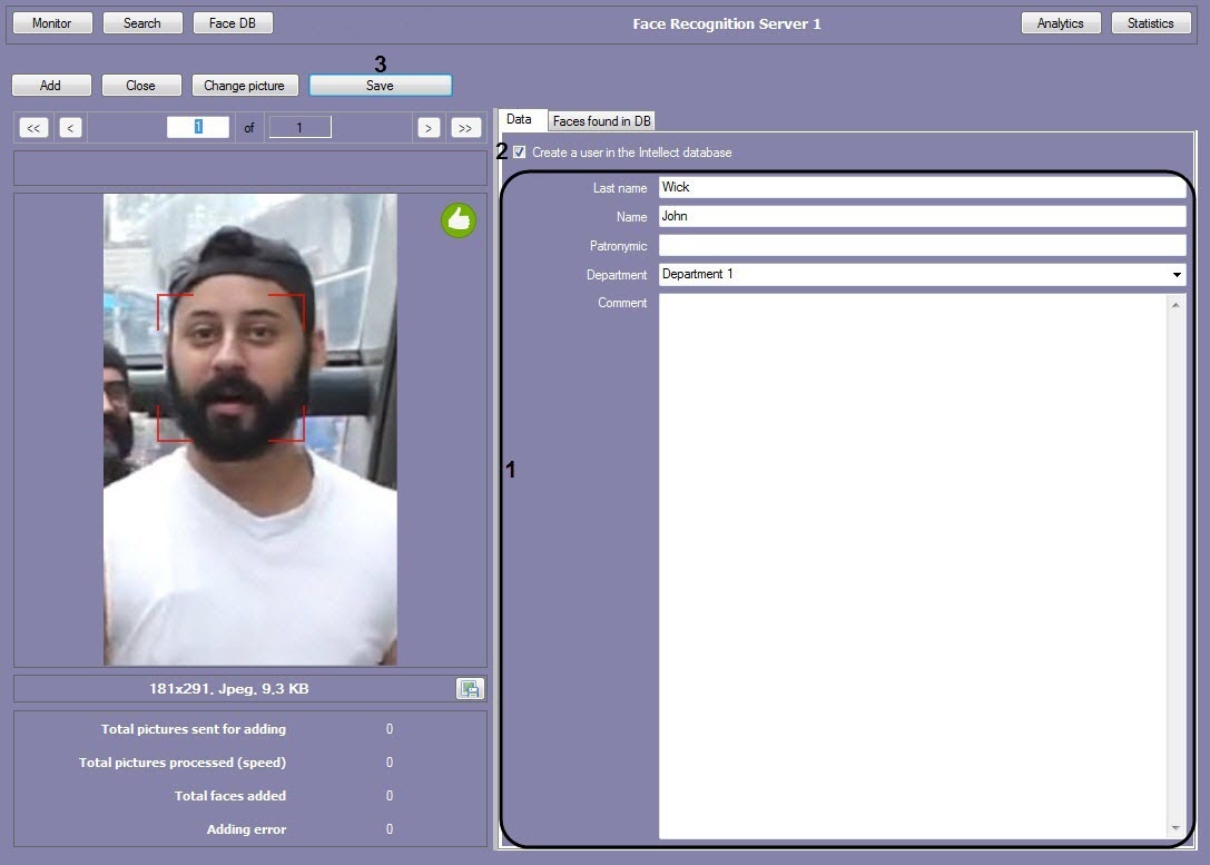 - Specify the required data about the person in the Last name, Name, Patronymic, Department and Comment fields, if they were not filled in automatically (see the Upload an image to the reference face database section) (1).