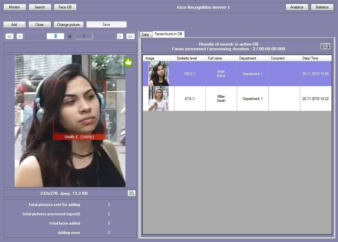 All images added to the reference face database are also listed in the Faces found in DB tab.