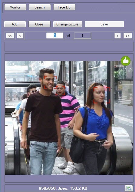 If there are several faces on the added image, they are framed with a red frame and the Save button is disabled. To add a person to the reference face database, left-click on one of the framed faces.