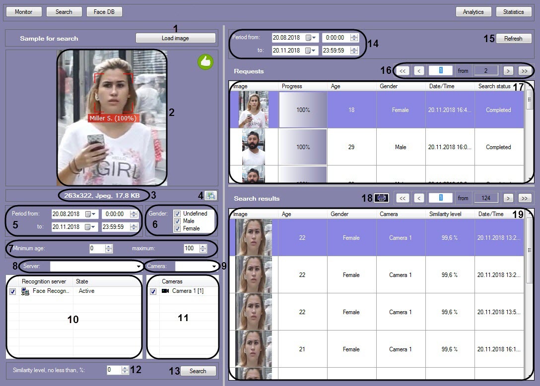 14 | The elements for setting the date and time for the beginning and end of the time interval for search results displaying |