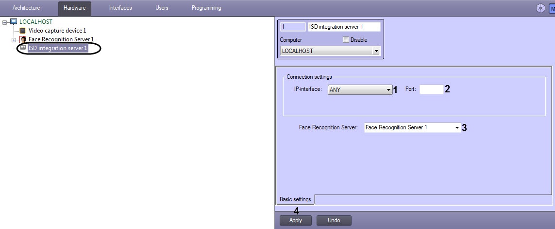 - Specify the IP-interface (1) and Port (2) of this Face Recognition Server integration point to which the paid access system components will be connected.