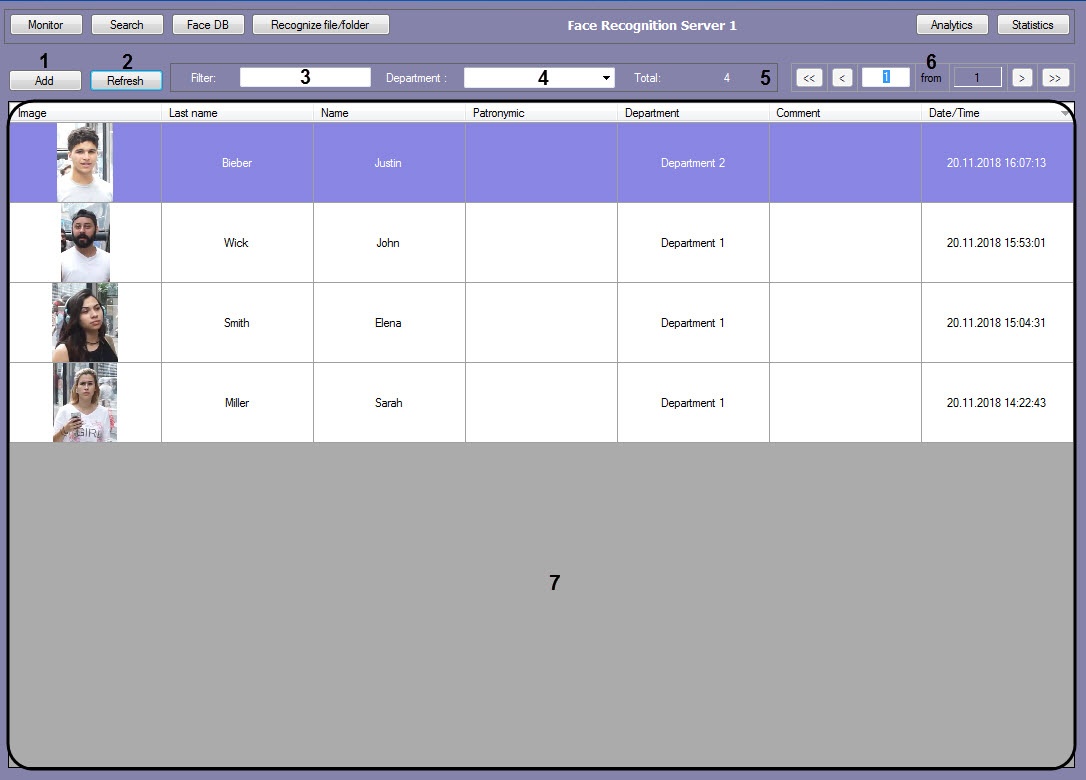 The following figure shows the Face database window interface: