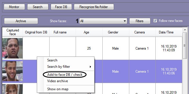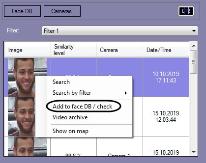You can also add the face to the reference face database by right-clicking on the image in the Cameras section in the lower right part of the captured faces monitoring panel and selecting the corresponding menu item.
