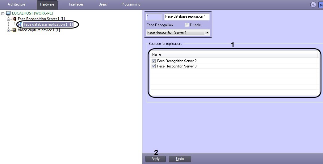 - In the Sources for replication list (1), set the checkboxes for the Face Recognition Servers, the face database from which will be replicated to the current Face Recognition Server.