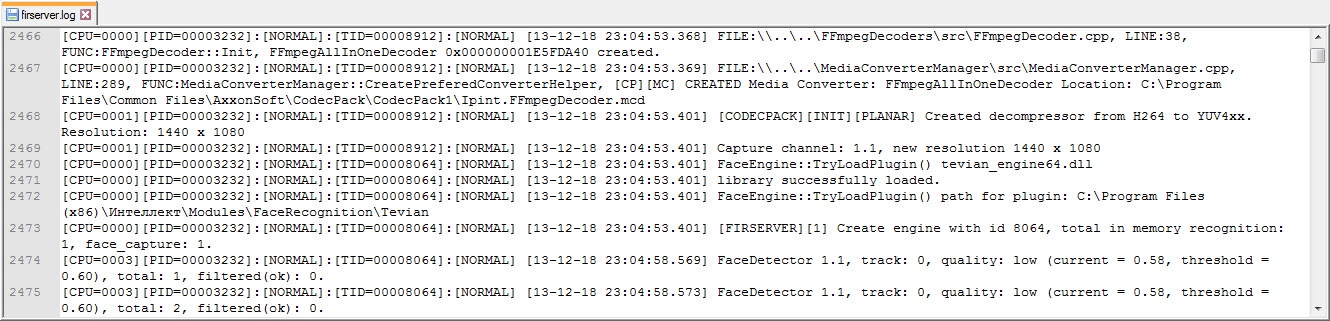 The firserver.log log file of the Face Recognition Server debug window is located at the following path: <Face Intellect installation directory>\Modules64\. This log file stores all events from the Face Recognition Server object.