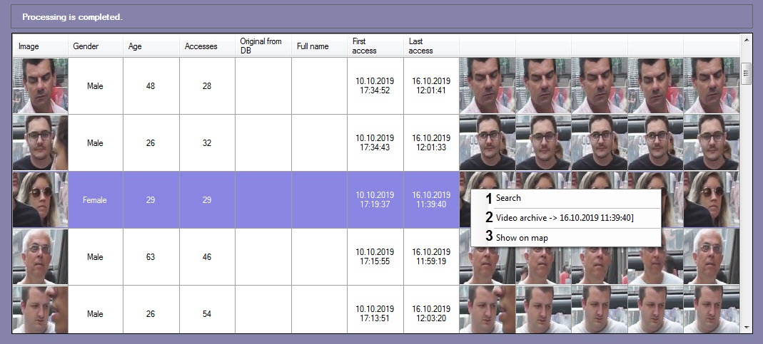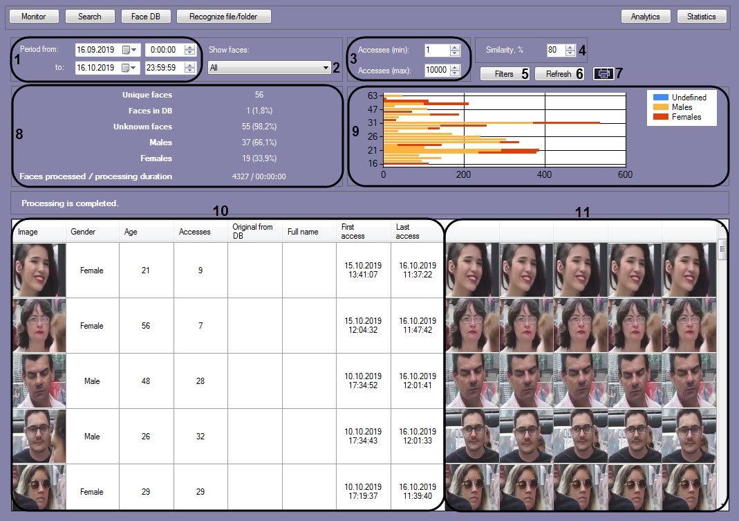 In the table (10) in the Image column the unique faces are displayed. Their quantity is equal to the Unique faces value shown in the section (8). The sum of the unique faces and the number of all their passes equals to the Faces processed value shown in section (8). In the area (11), the images of the last five passages of faces similar to the unique faces from the table (10) are displayed.
