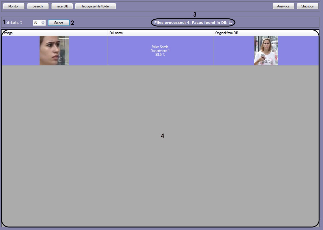 3 | The field for displaying the number of the processed files and the number of faces found in the reference database. |