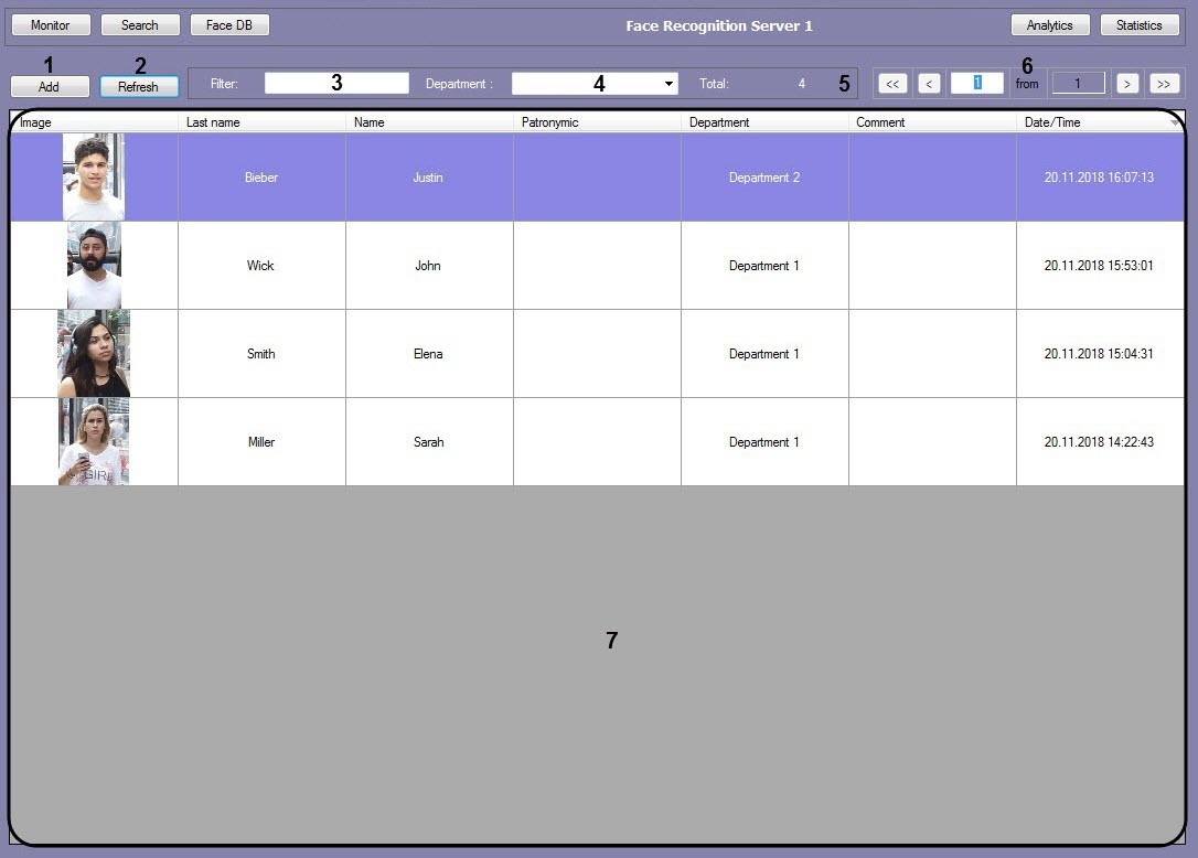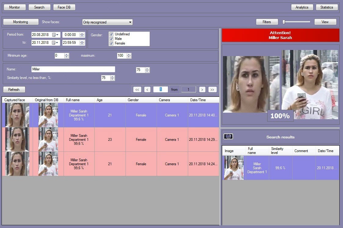 The Monitoring of captured and recognized faces window