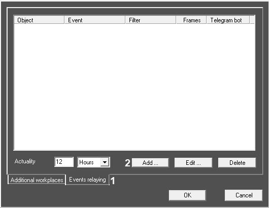 - On the Events relaying tab (1), click the Add button (2). As a result, the Event relaying form will open: