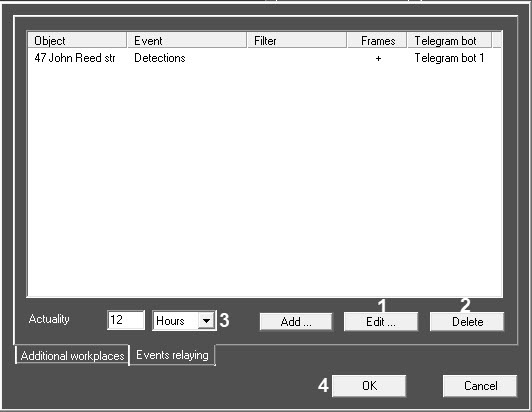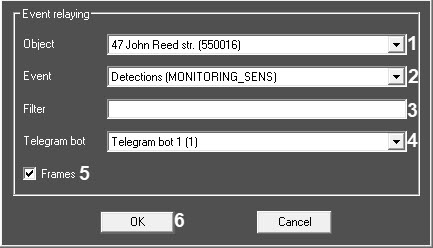 - If necessary, fill in the Filter field (3). Example: at the Agent Of Control object, when describing Monitoring events, two events are assigned to the Detection tools button: Camera disarmed and Camera armed. If you enter disarmed in the Filter field, then only the Camera disarmed event will be relayed to the Telegram bot.