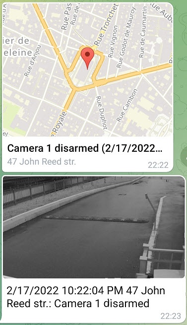 Set the Frames checkbox (5) to relay the JPEG frame linked to the event. When the checkbox is set, two messages will be sent to Telegram: an alarm, and then a frame: