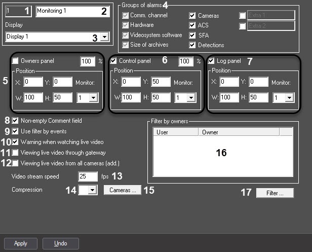 15 | Cameras... button | Click the button | Opens a window for configuring cameras prohibited from viewing live video for users | - | - | - |