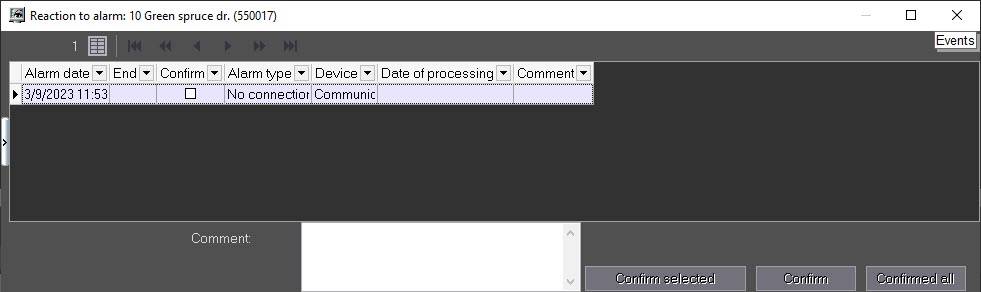 If you check the Confirm box in the Reaction to alarm window, the icon's background in the Control panel changes from red to orange and the Date of processing column is automatically filled.