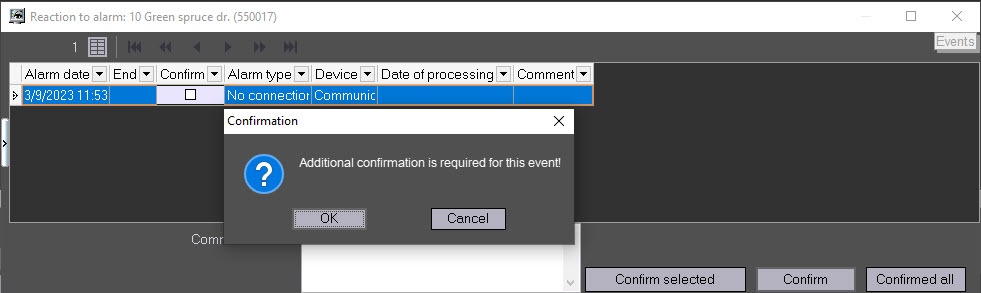 Note that the Date of processing column will contain not the current computer time, but the current update time (see the Current Update Time section) stored in the database. This ensures that the operator cannot roll back the system time to confirm the alarm with a different time.