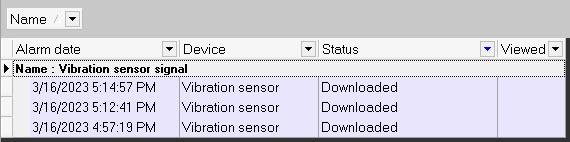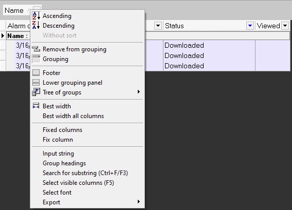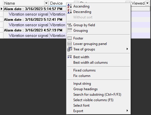 By default, video data are grouped by alarm time. If necessary, it is possible to set video data grouping by other parameters. To do so, in the context menu of a column, by which one need to group the data, select Group by field.