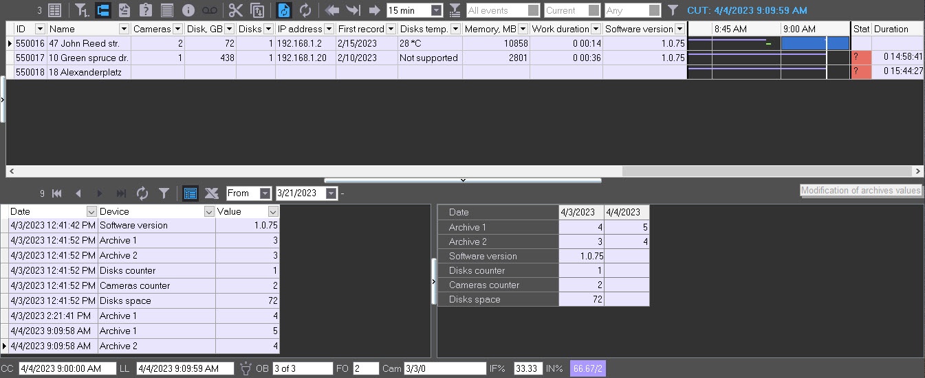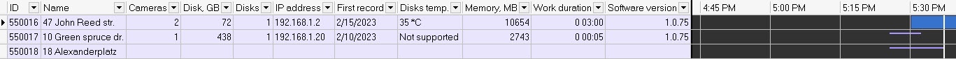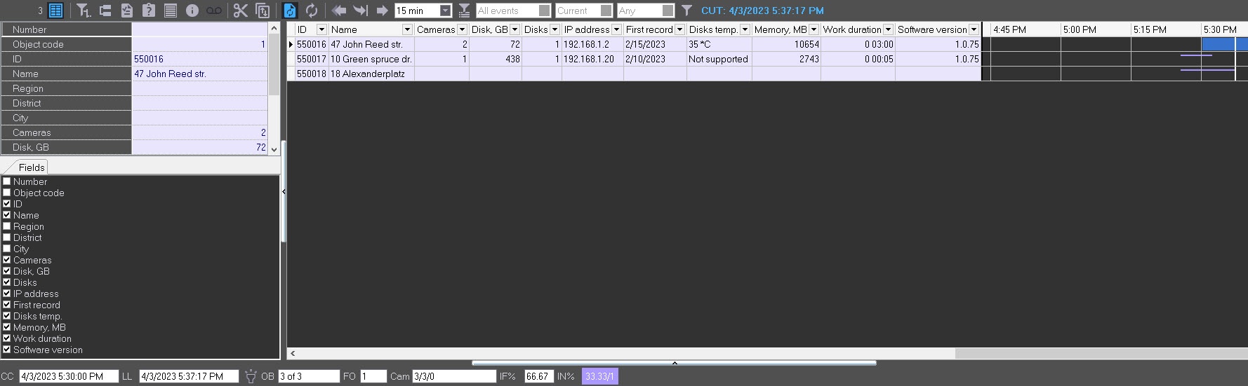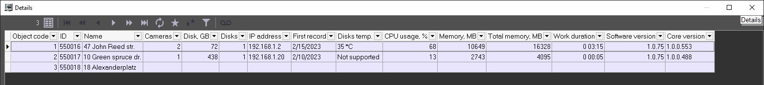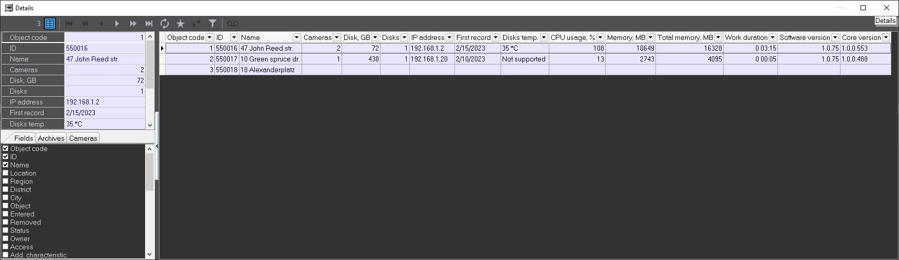 The data in the Cameras, Disk, GB, Disks, and Software version fields and in all the fields in the Archives and Cameras tabs are filled in automatically when packets with technical information are received from the objects. If these fields are empty for an object, it means that the object never connected yet.