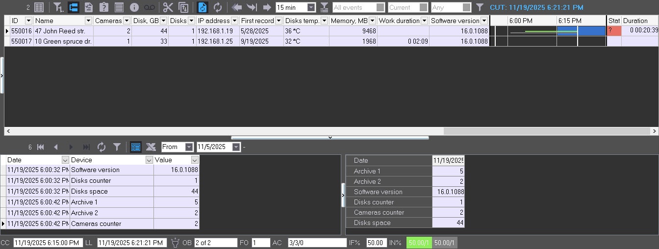 When you click the button (Show characteristics of devices), a special area appears. There you can see changes in the values of the fields described above (Cameras, Disk, GB, Disks, Archive, GB, Software version, and others).