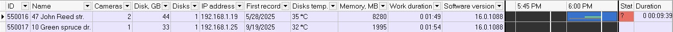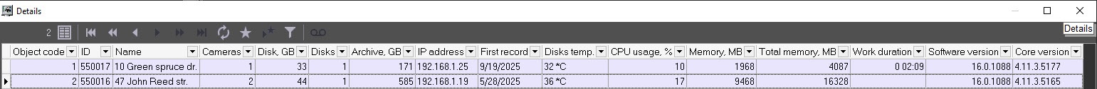 The data in the Cameras, Disk, GB, Disks, Archive, GB, and Software version fields and in all fields in the Archives and Cameras tabs are filled in automatically when packets with technical information are received from the objects. If these fields are empty for an object, it means that the object has never connected yet.