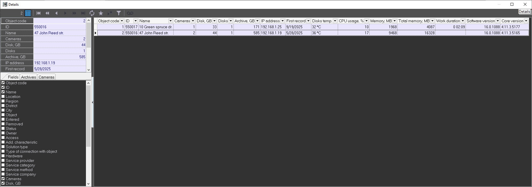 The lower part of the area contains three tabs: Fields, Archives, and Cameras. Information on the selected parameters is displayed as columns in the main list of the Details window.