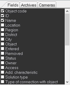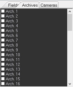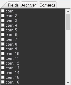 The lower part of the area contains three tabs: Fields, Archives, and Cameras. The information is shown (according to the options selected) as columns in the main list of the Details window.