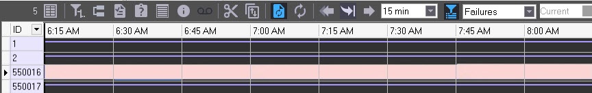 The number of failures is calculated not for each interval, but for a range of intervals. Consider the case depicted in the figure. Here, the calculation is performed for eight columns of 15 minutes. Even if the maximum number of failures is exceeded in three columns, the background of all eight columns gets pink.