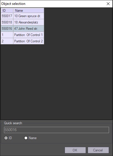 3. For quick search by object identification number, set the switch in the bottom of the box to ID and enter the number in the Quick search field. The match, if found, is displayed in the Quick search field while the corresponding object is automatically selected in the list.