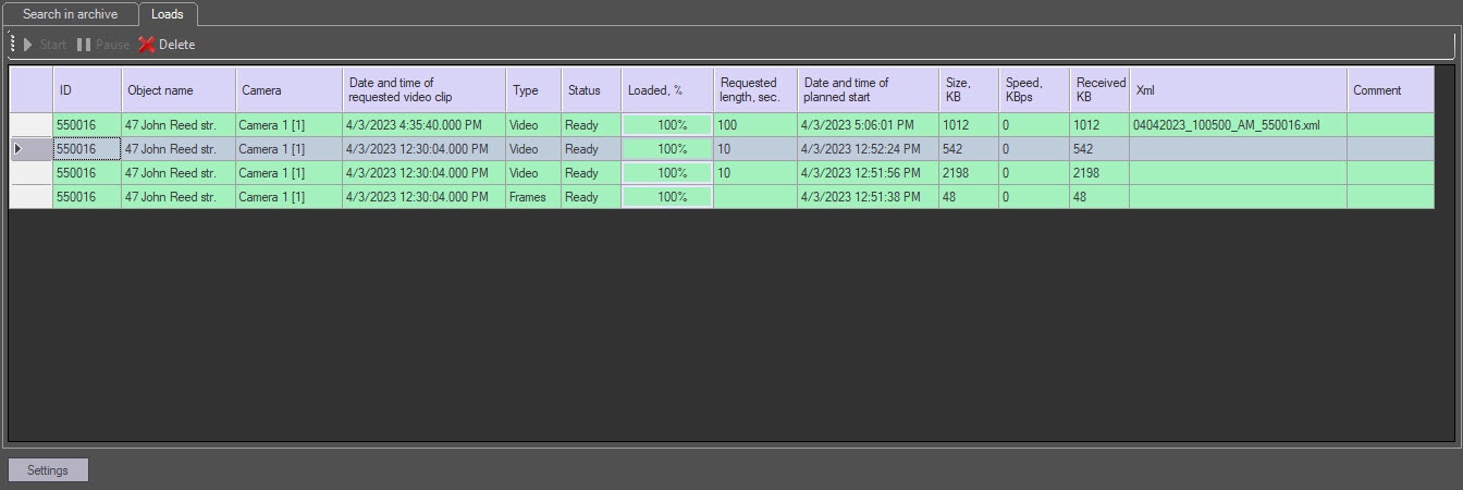 The Search in archive module scans the In directory for the request files every 10 seconds. When the request file appears, the task is set up to load the video clip according to the contents of this file. At this point, the request file is moved to the In\Work directory. If the Titles parameter is set to a value other than 0, the query for finding titles in the specified time period from DateTimeBegin to DateTimeEnd is pre-executed. If the search is successful, a request is generated to load the video, in which the date and time of the first record in the title search results is specified as the date and time of the beginning of the export from the archive.