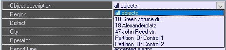 Region, District and City in which the objects are located. This information is configured on the Control panel − see Editing regulatory and reference information. If a specific object is selected (see step 1), then these fields are hidden in the report settings window.