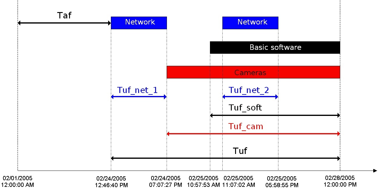 The following figure shows an example of different failures at the object by which availability and unavailability factors are calculated.