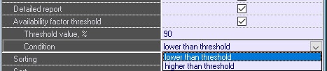 - Set the Availability factor threshold checkbox to filter objects by the additional condition, the availability factor threshold value, to display the Threshold value, % and Condition parameters: