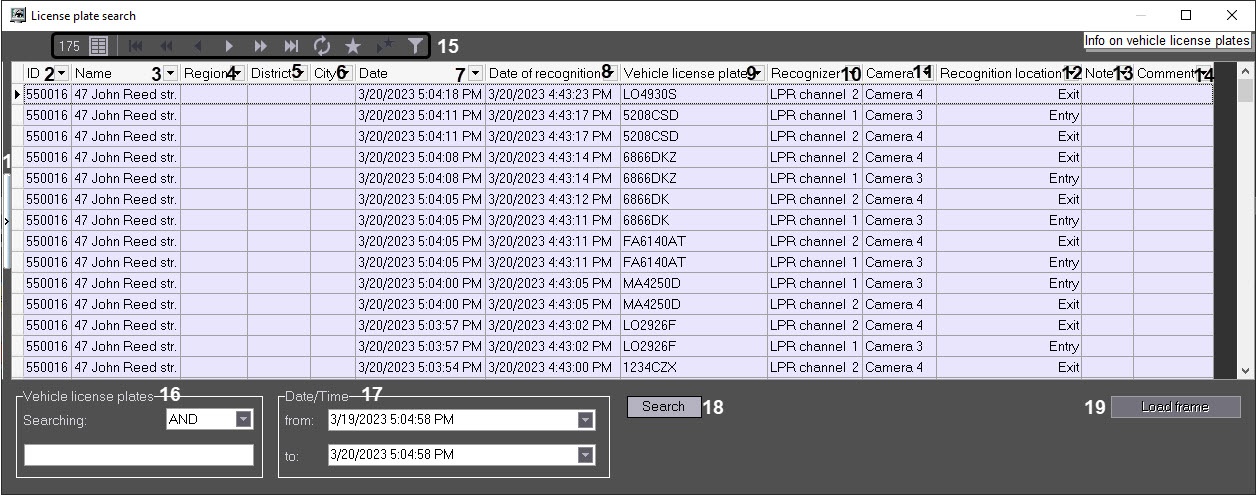 Date when the frame from the camera was recognized is shown in the Date of recognition column