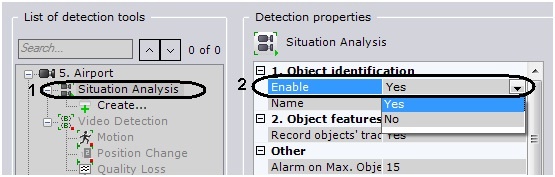 1. In the Detection Tools list, highlight a Situation analysis object (1) which offers a means of analyzing the situation in the field of view of the required video camera.