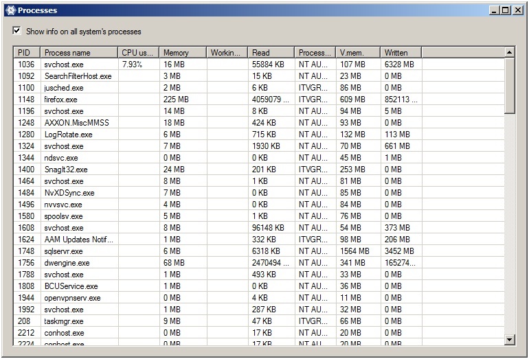 Selecting the Display information about all system processes check box enables viewing of all processes running on the computer.