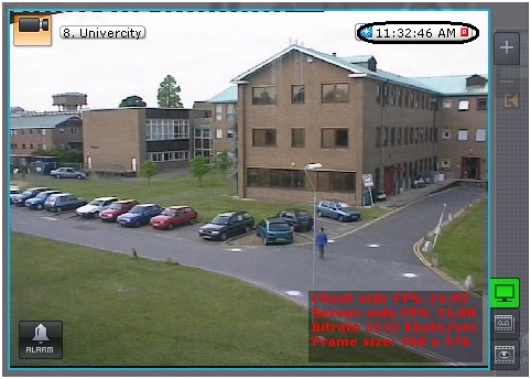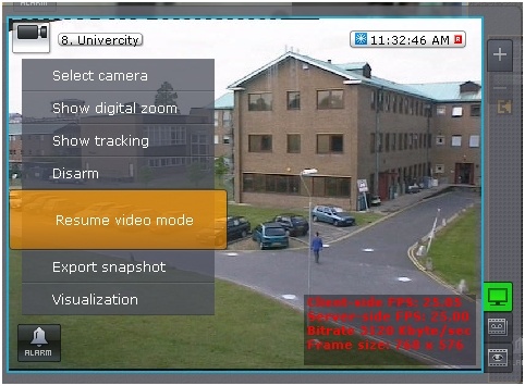 To turn off the Snapshot function, select the Resume video mode option in the context menu of the viewing tile or click the time indicator again (see the section titled Time Display).