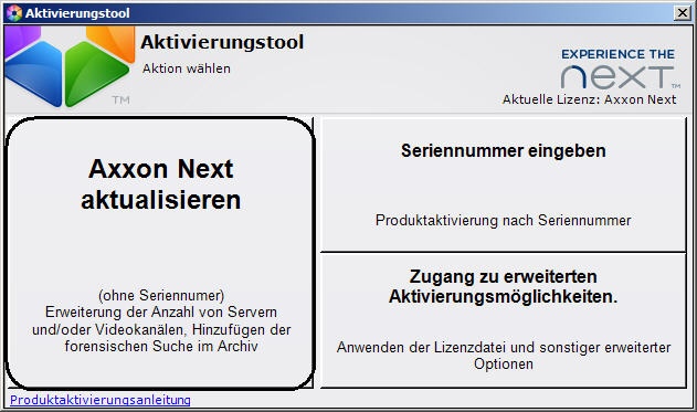 1. Klicken Sie auf der Hauptseite des Aktivierungstools auf die Schaltfläche Axxon Next Aktualisieren.
