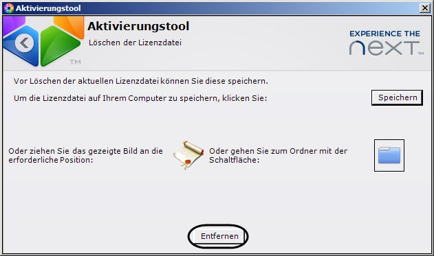 Vor der Entfernung aus dem System kann die Lizenzdatei auf eine der angebotenen Arten gespeichert werden.