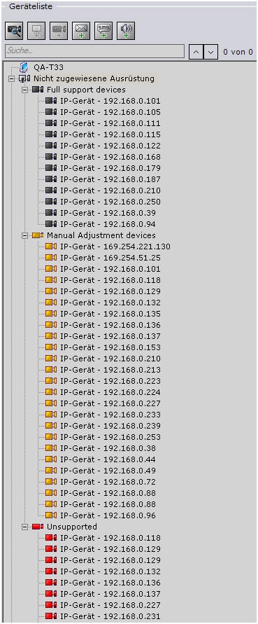 Die Geräte werden in die Liste Nicht zugewiesene Ausrüstung übertragen, ohne Kontrolle der Existenz im Netzwerk. Um diese Liste zu aktualisieren, muss eine Gerätesuche gestartet werden (mit der Schaltfläche