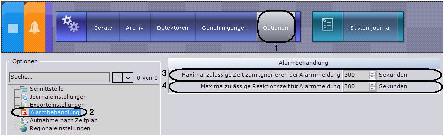 3. Geben Sie in der Gruppe Maximal zulässige Reaktionszeit für Alarmmeldung den Zeitraum in Sekunden ein, während dem der Bediener, der den Alarm zur Verarbeitung entgegengenommen und den Alarmquittierungsmodus ohne Auswertung verlassen hat, in diesen Modus zurückkehren muss (4).