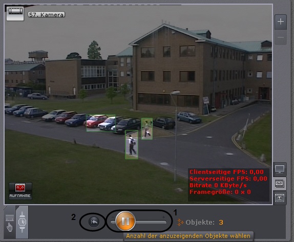 Zur Einstellung der gewünschten Anzahl nachverfolgter Objekte, die gleichzeitig dargestellt werden sollen, stellen Sie den Schieber auf die entsprechende Position (1). Befindet sich der Schieber ganz links, werden zwei Objekte dargestellt, befindet er sich ganz rechts, werden sechs Objekte dargestellt.