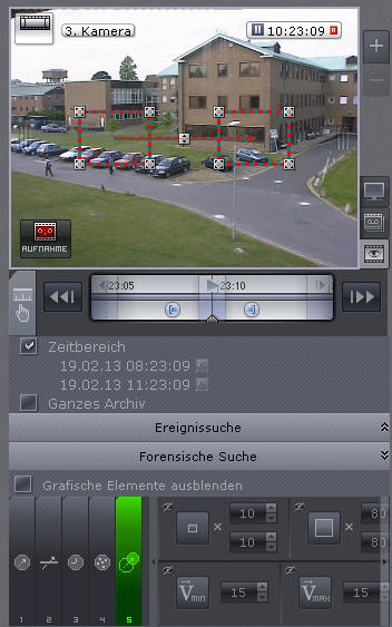 Es ist möglich, die graphischen Fensterelemente der Videoüberwachung auszublenden, wenn diese die Bearbeitung der visuellen Elemente stören. Dafür müssen Sie das Kontrollkästchen Graphische Elemente über dem Suchfenster ausblenden aktivieren.
